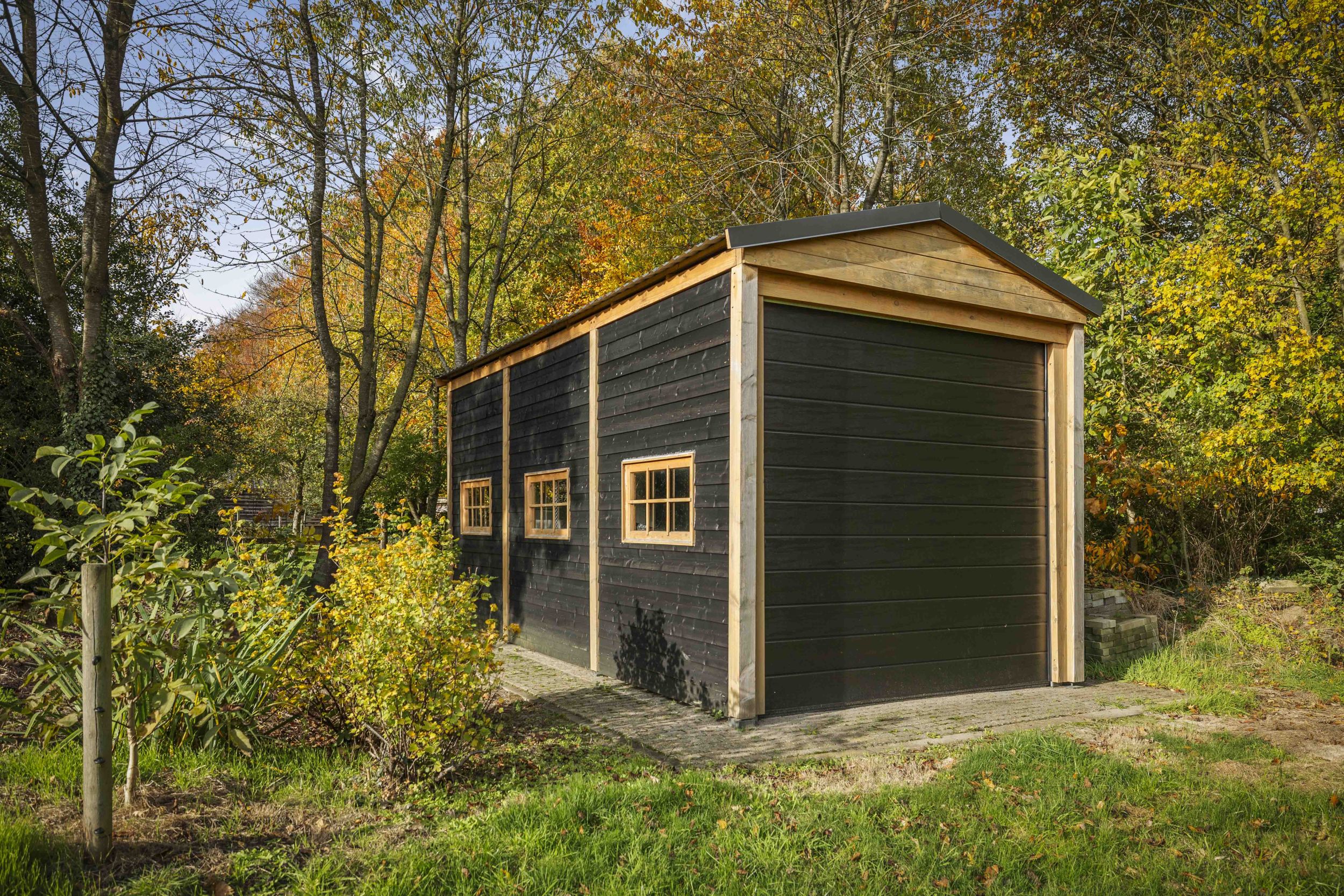 Berging: Dubbele aangebouwde garage, 2 vrijstaande houten garages en vrijstaande stenen schuur