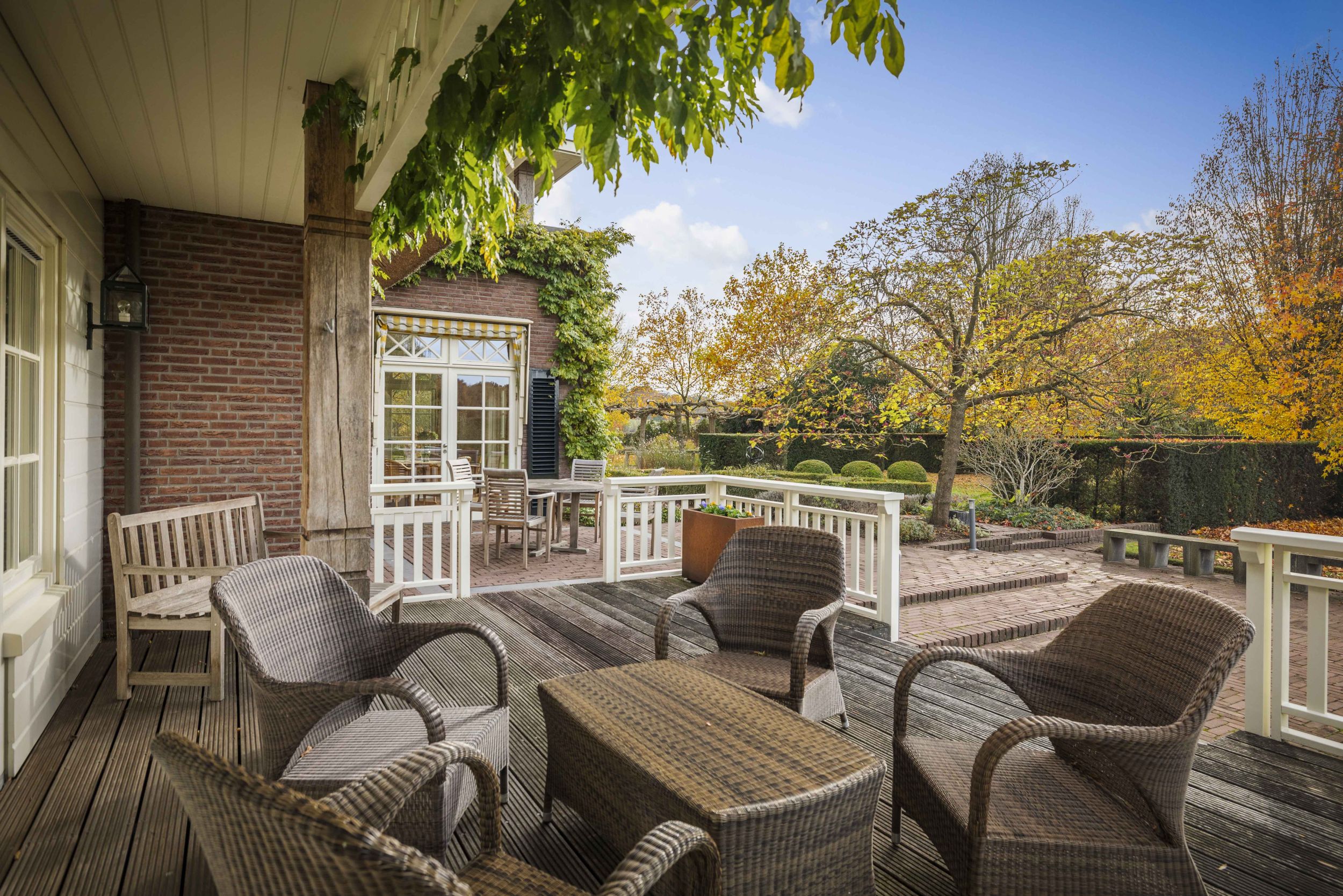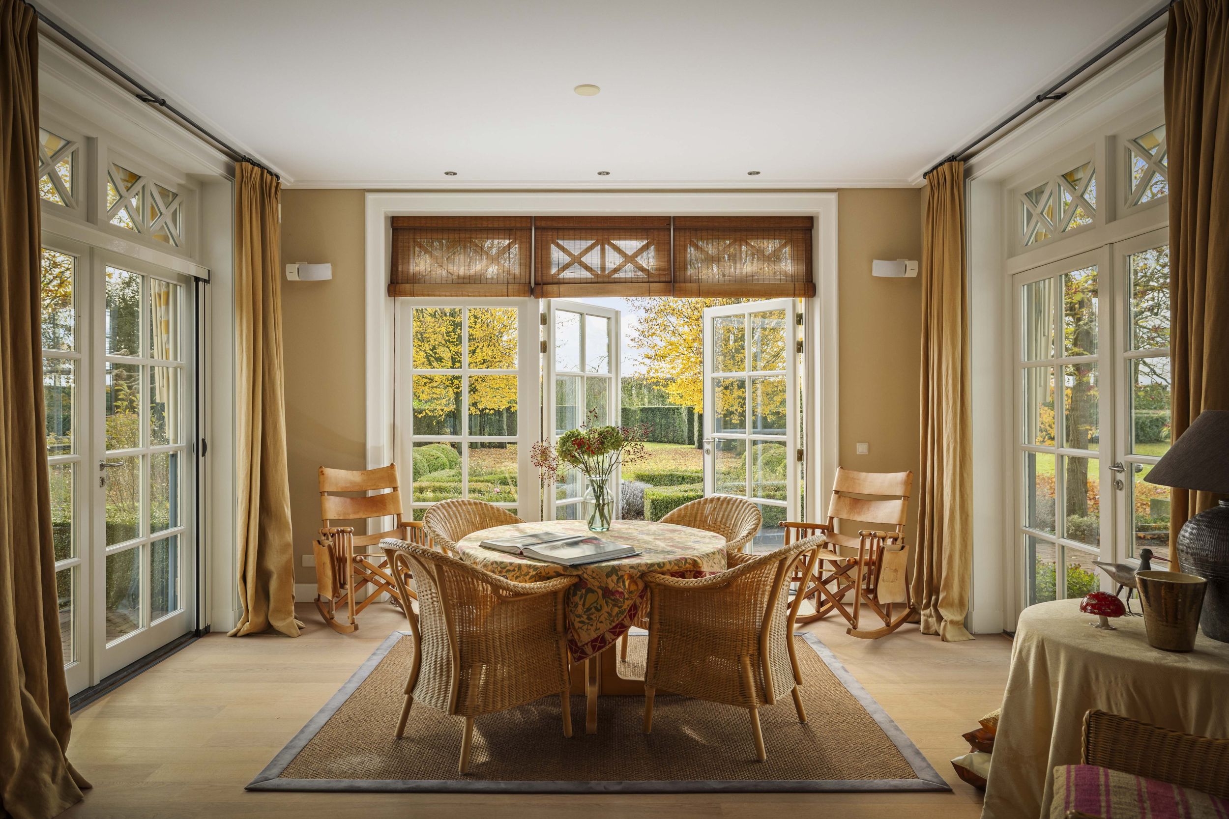 Vanuit de living en de study toegang tot de sfeervolle tuinkamer, die aan drie zijden opent naar de tuinen. Ook deze is voorzien van op maat gemaakte kasten en is door de lichtval ook perfect geschikt voor een schildersatelier
