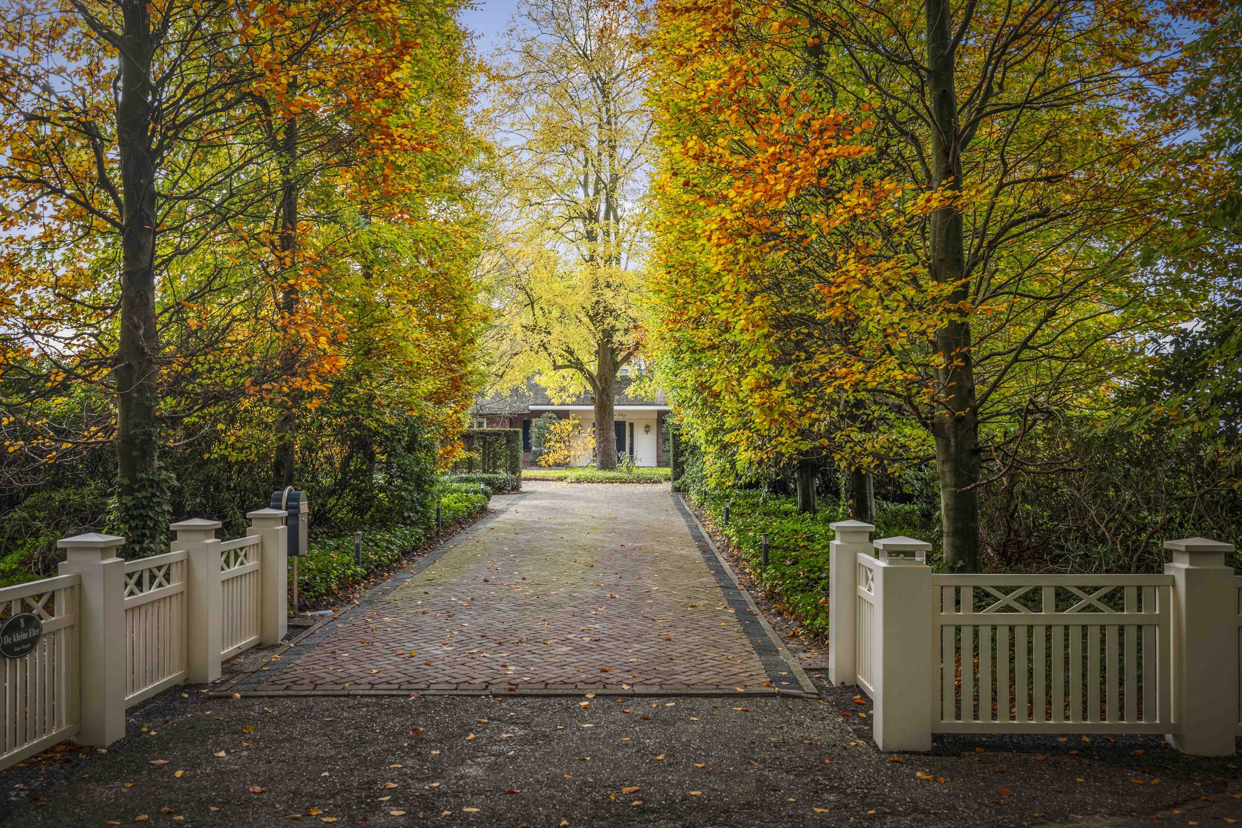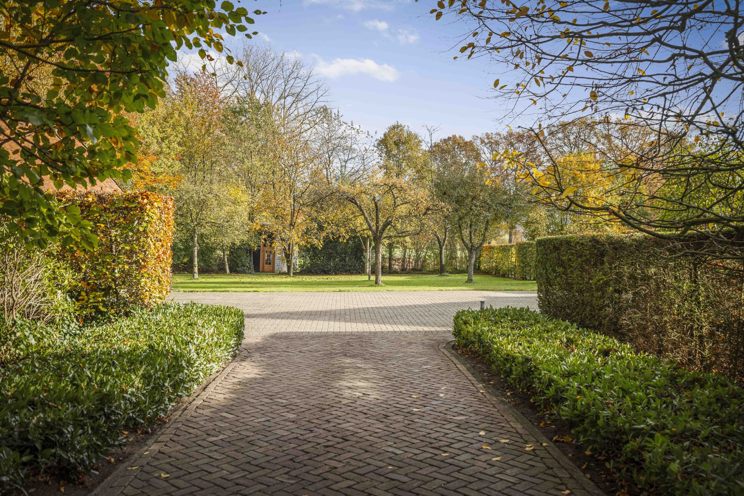 Door een tunnel van groen wordt men naar de oprit geleid. Het terrein is afgebakend met witte hekken en rijzige haagbeuken. Aan de rand van het terrein staat de oude jongveestal, die als restant van de voormalige boerderij zichtbaar is.