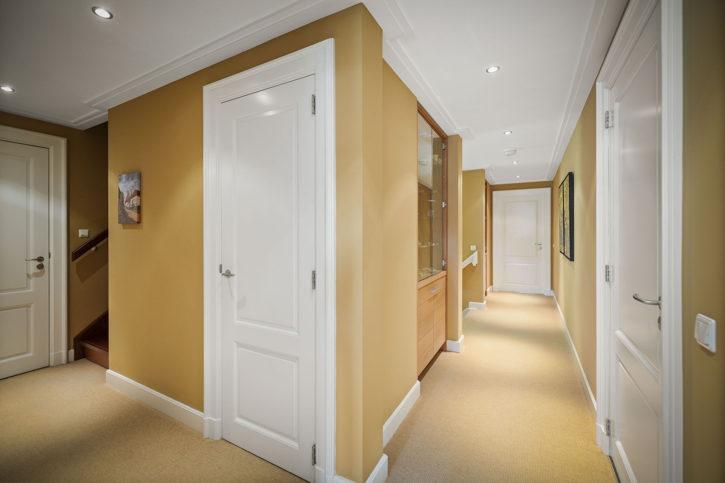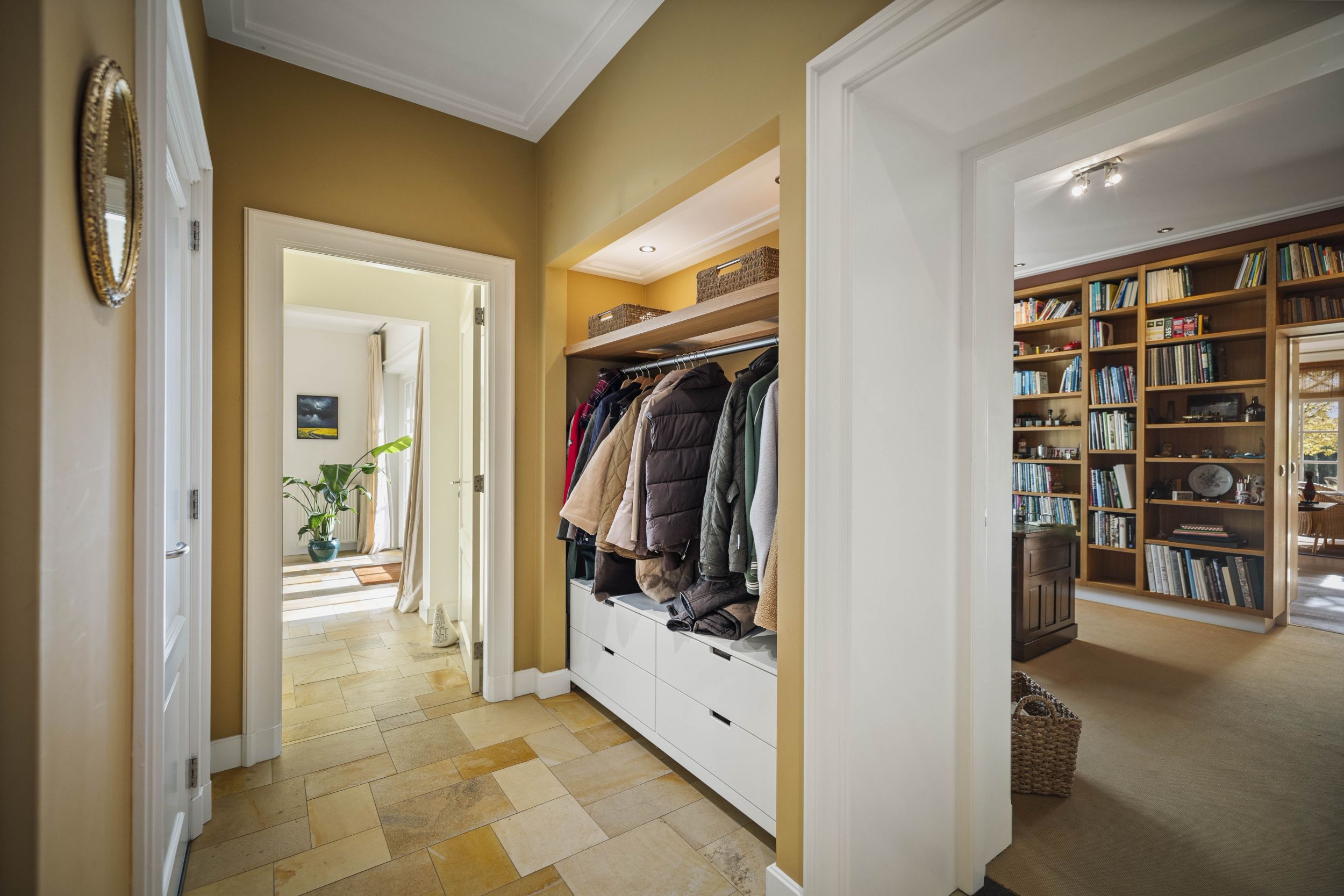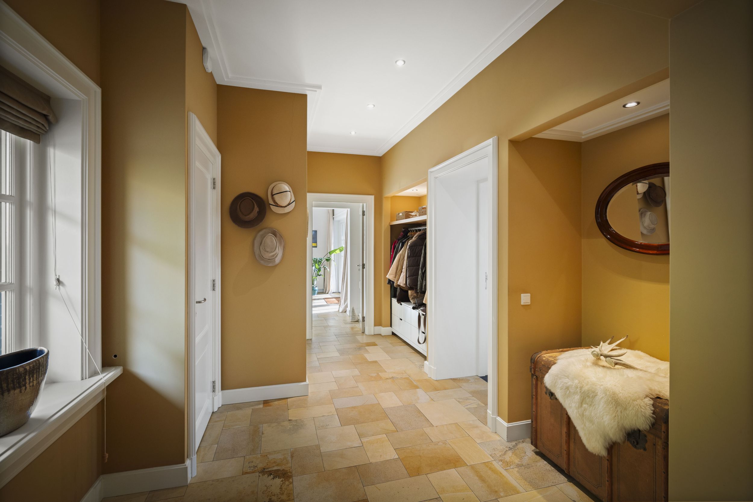 Entree onder de grote centrale luifel, in de centrale hal. Deze prachtige hal is belegd met Sohlnenhofen steen in schakeringen van oker. Het witte houtwerk van de dubbele bordestrap contrasteert fraai tegen de okergele wanden, die zelfs op de druilerigste dagen een warme zonnige toets bieden. Meteen links de meterkast en de WC en de hal met de toegang naar de oprit, de tuin en de bijkeuken met pantry met zandkleurige fronten, een stenen werkblad en een dubbele rvs-spoelbak. Aansluitend twee nissen met de garderobe en de toegang tot de study. Rechts de toegang tot de keuken en rechtdoor tot de living.