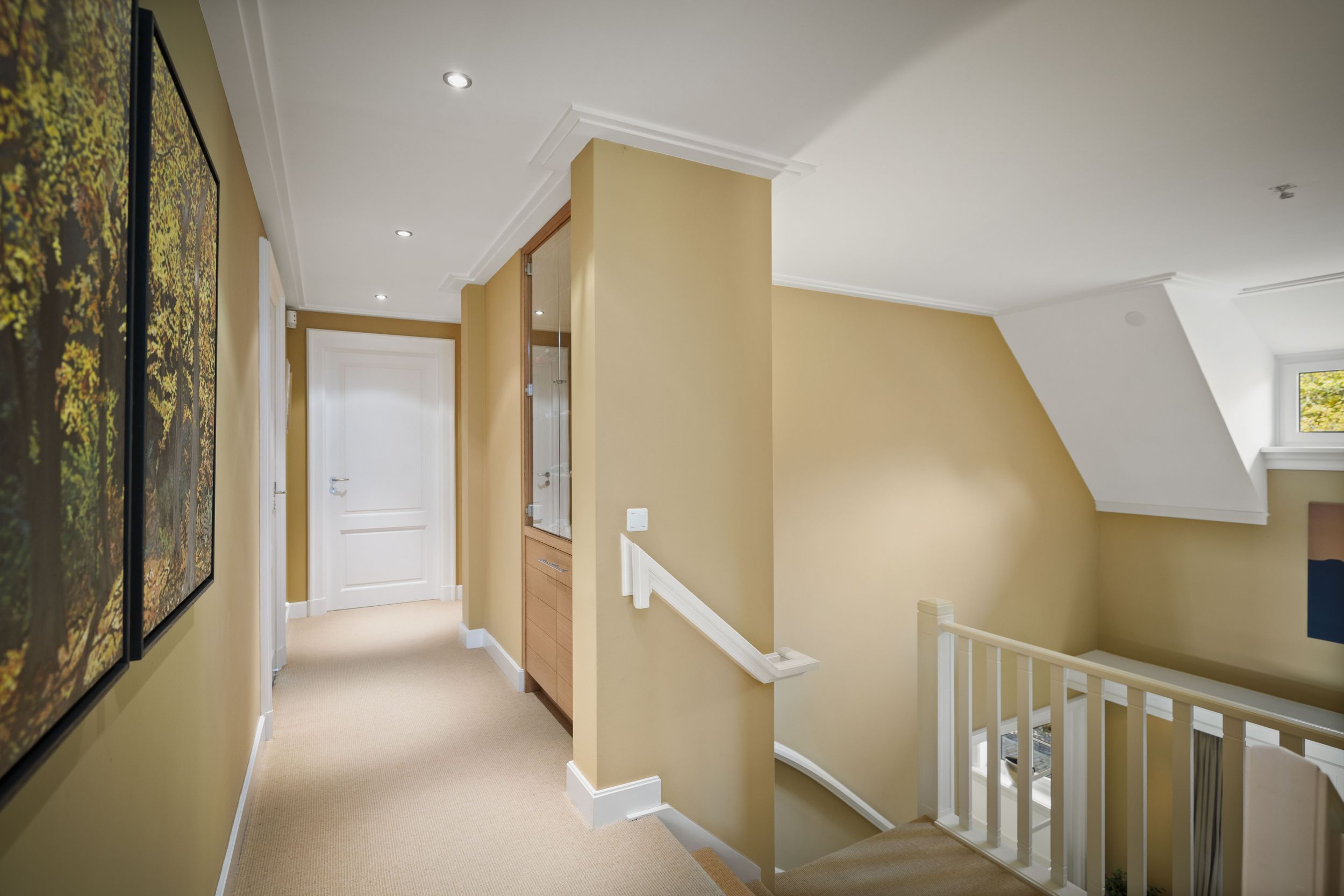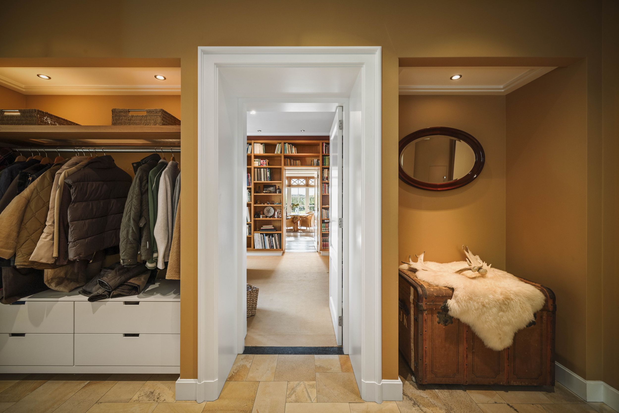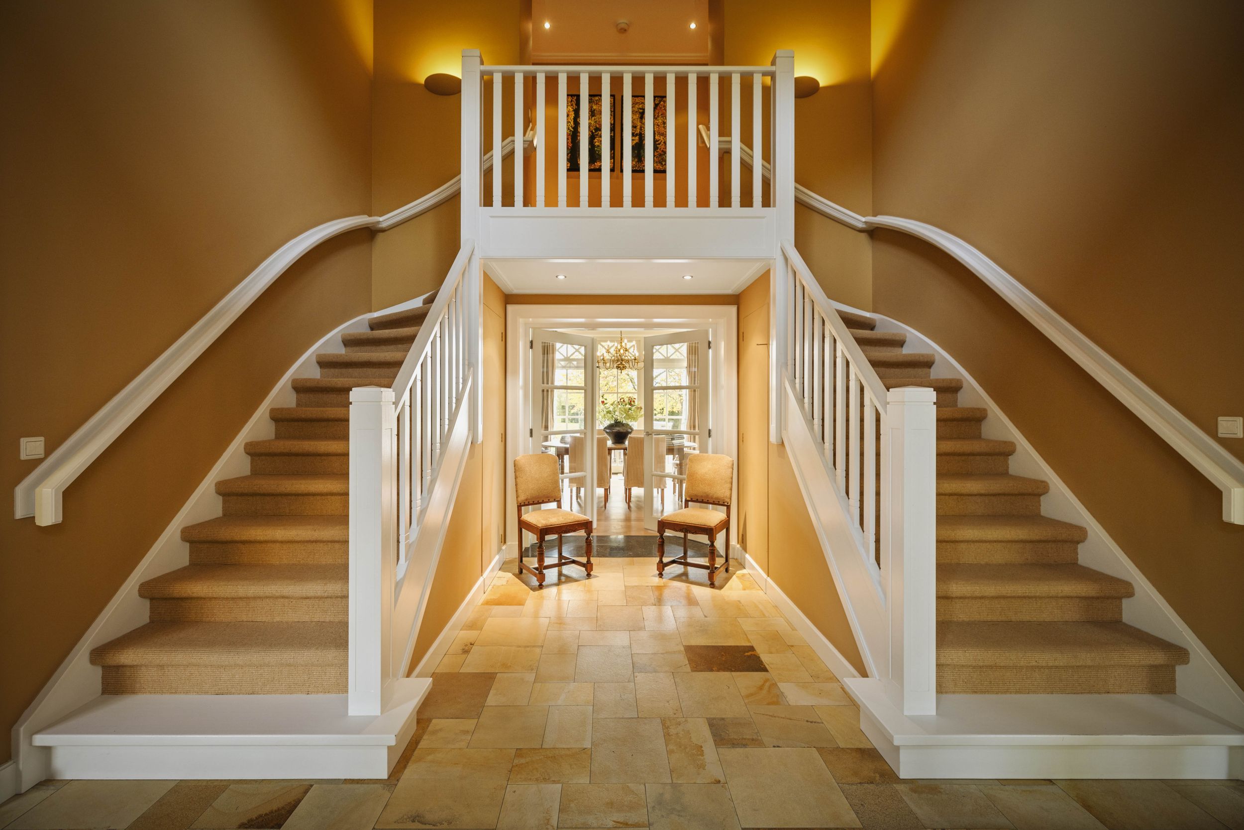 Entree onder de grote centrale luifel, in de centrale hal. Deze prachtige hal is belegd met Sohlnenhofen steen in schakeringen van oker. Het witte houtwerk van de dubbele bordestrap contrasteert fraai tegen de okergele wanden, die zelfs op de druilerigste dagen een warme zonnige toets bieden. Meteen links de meterkast en de WC en de hal met de toegang naar de oprit, de tuin en de bijkeuken met pantry met zandkleurige fronten, een stenen werkblad en een dubbele rvs-spoelbak. Aansluitend twee nissen met de garderobe en de toegang tot de study. Rechts de toegang tot de keuken en rechtdoor tot de living.
