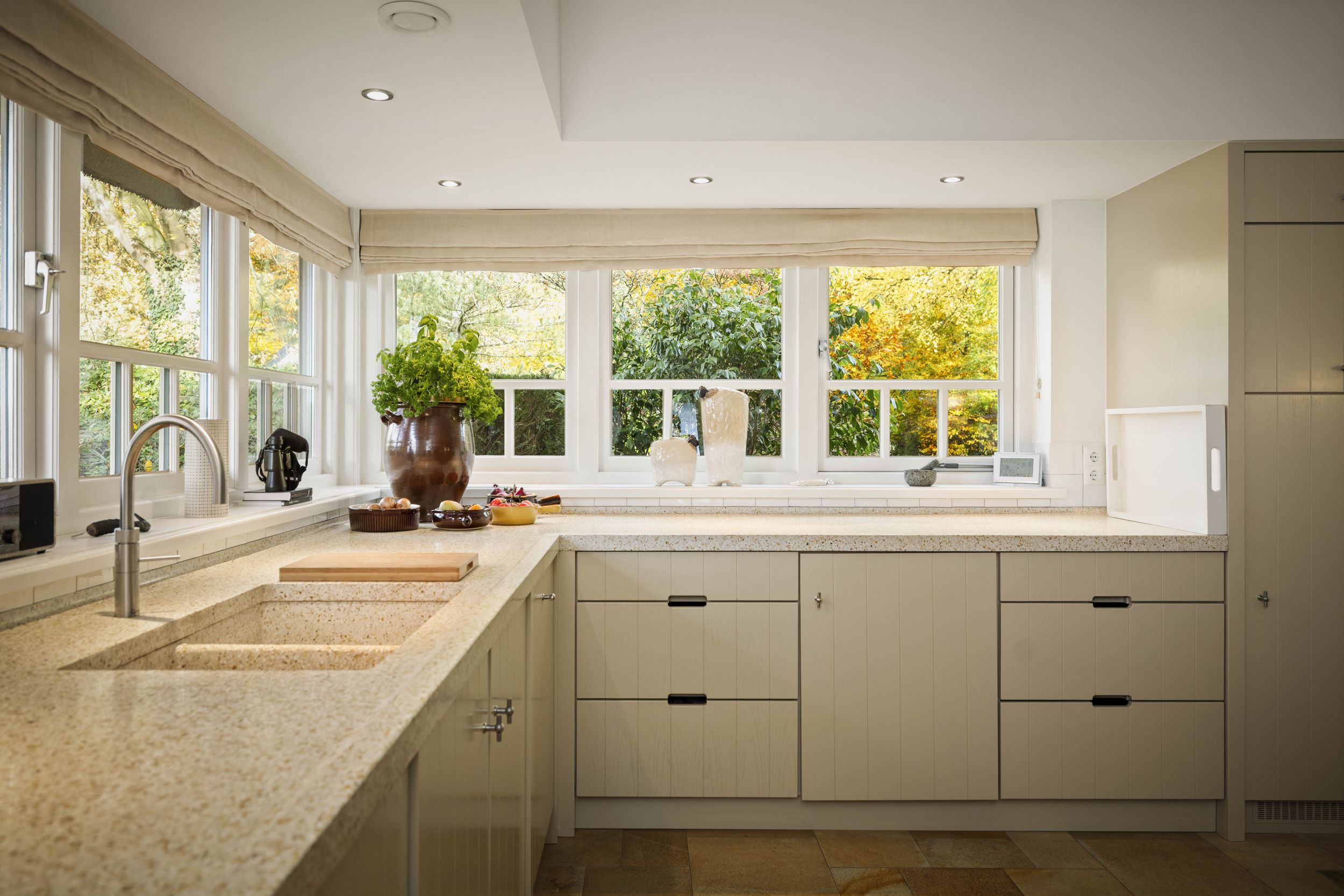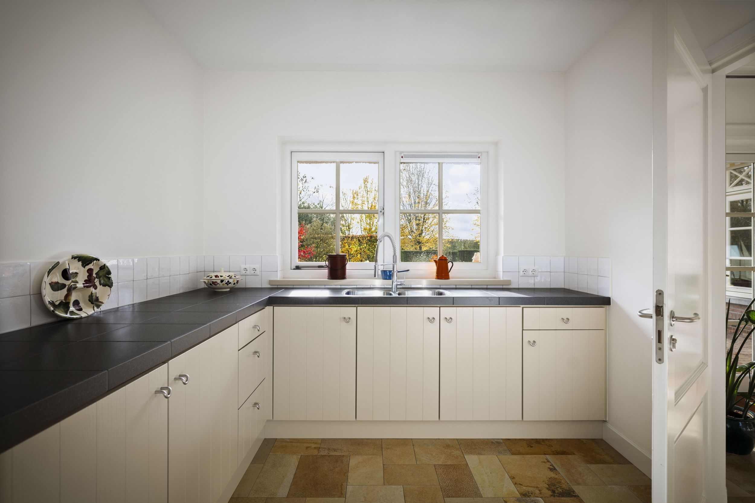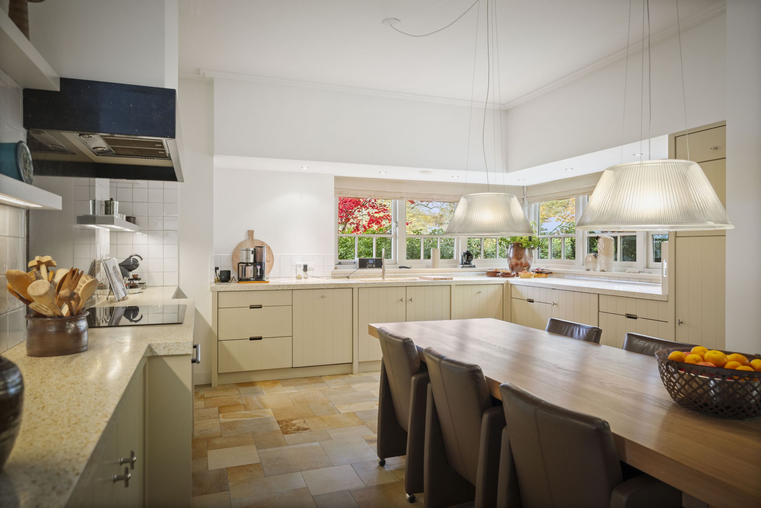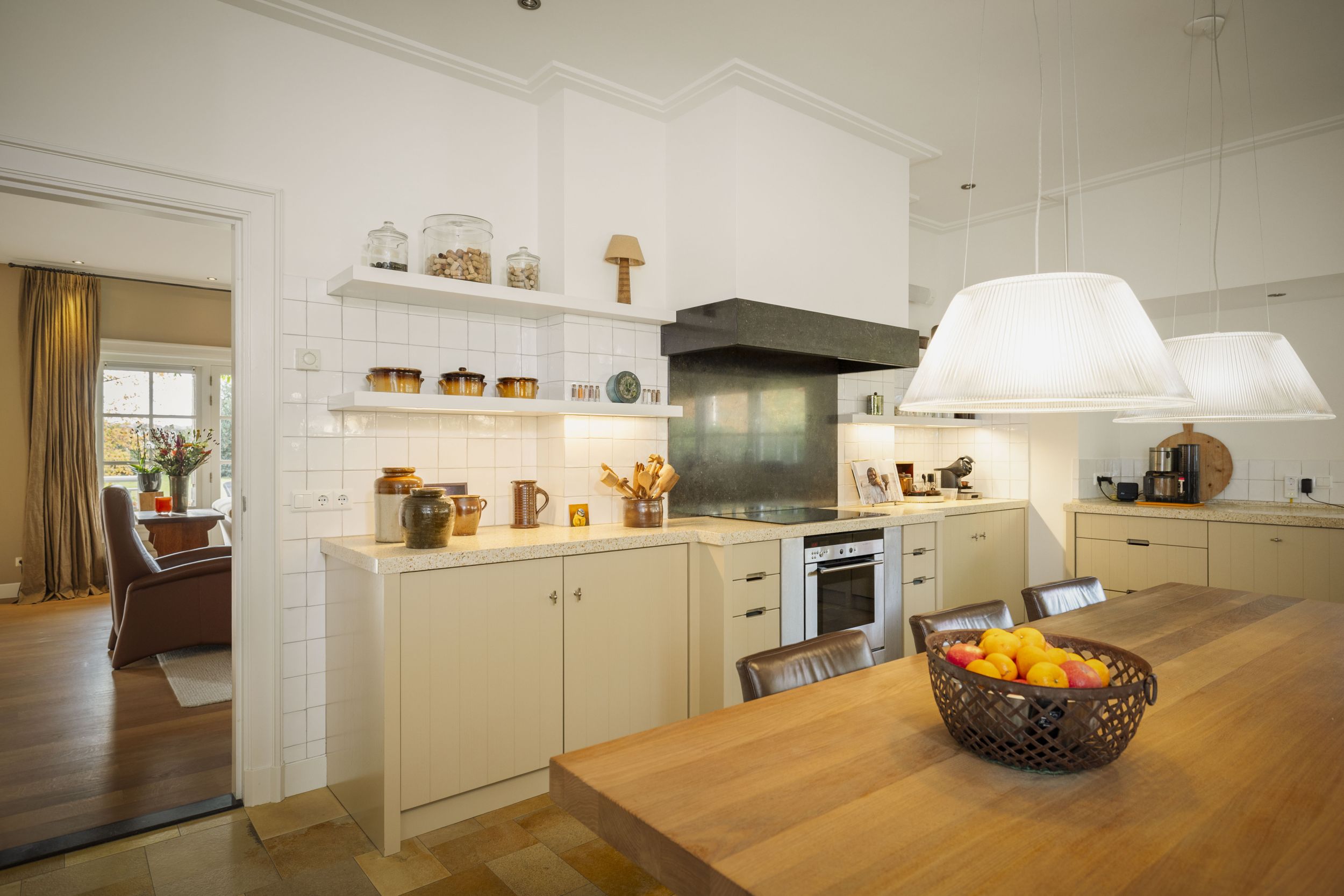 De keuken is een heerlijke plek; de lange eettafel nodigt uit tot een pauze met een kopje thee en de krant, of een lui zondags ontbijt. De keuken is prachtig, ambachtelijk handwerk met lichte fronten en een terrazzo werkblad. De achterwand en schouw rond de inductieplaat zijn uit Belgische hardsteen vervaardigd. De keuken is uiteraard voorzien van alle wenselijke inbouwapparatuur, zoals afwasmachine, heteluchtoven (Siemens), koelvriescombinatie en een 4-in-1 kokendwaterkraan (Quooker).