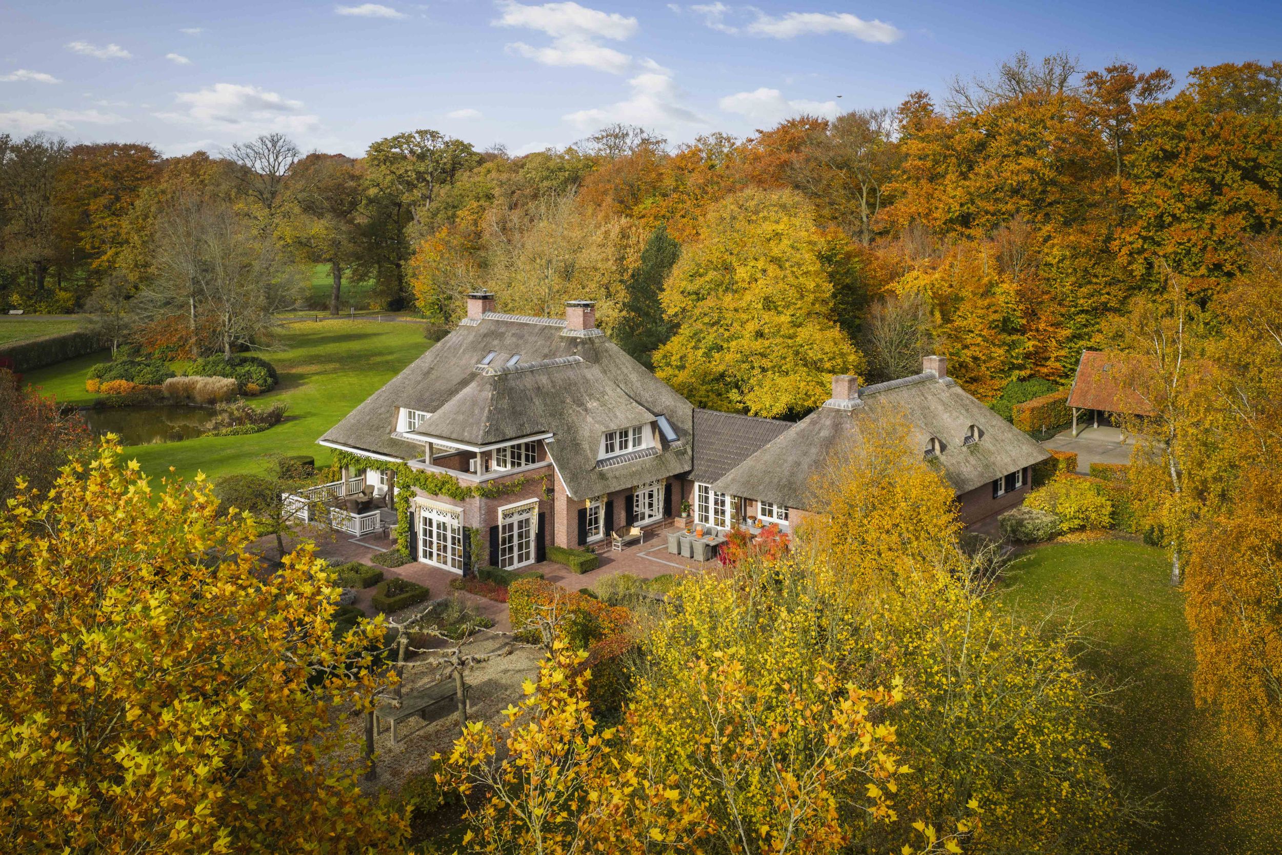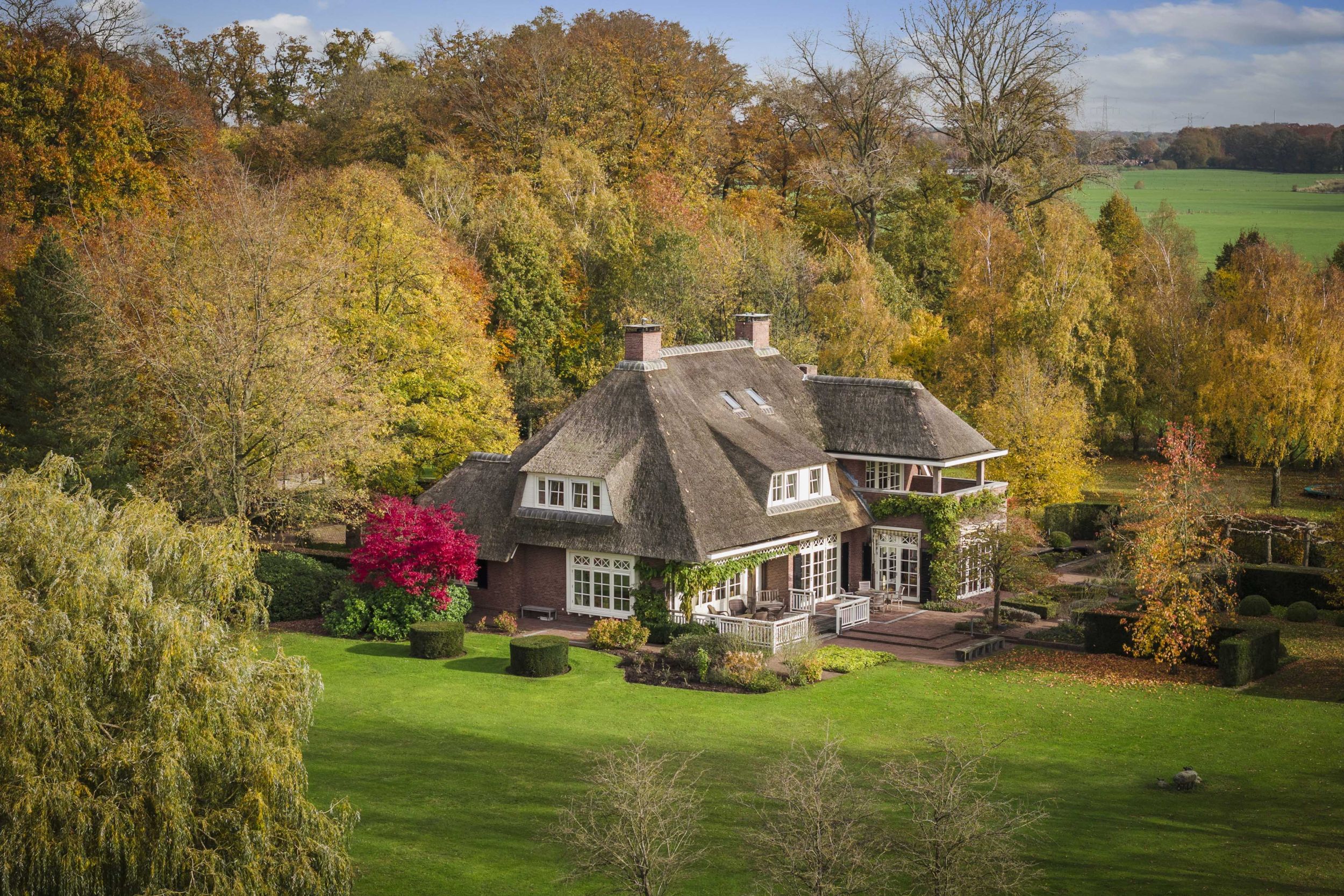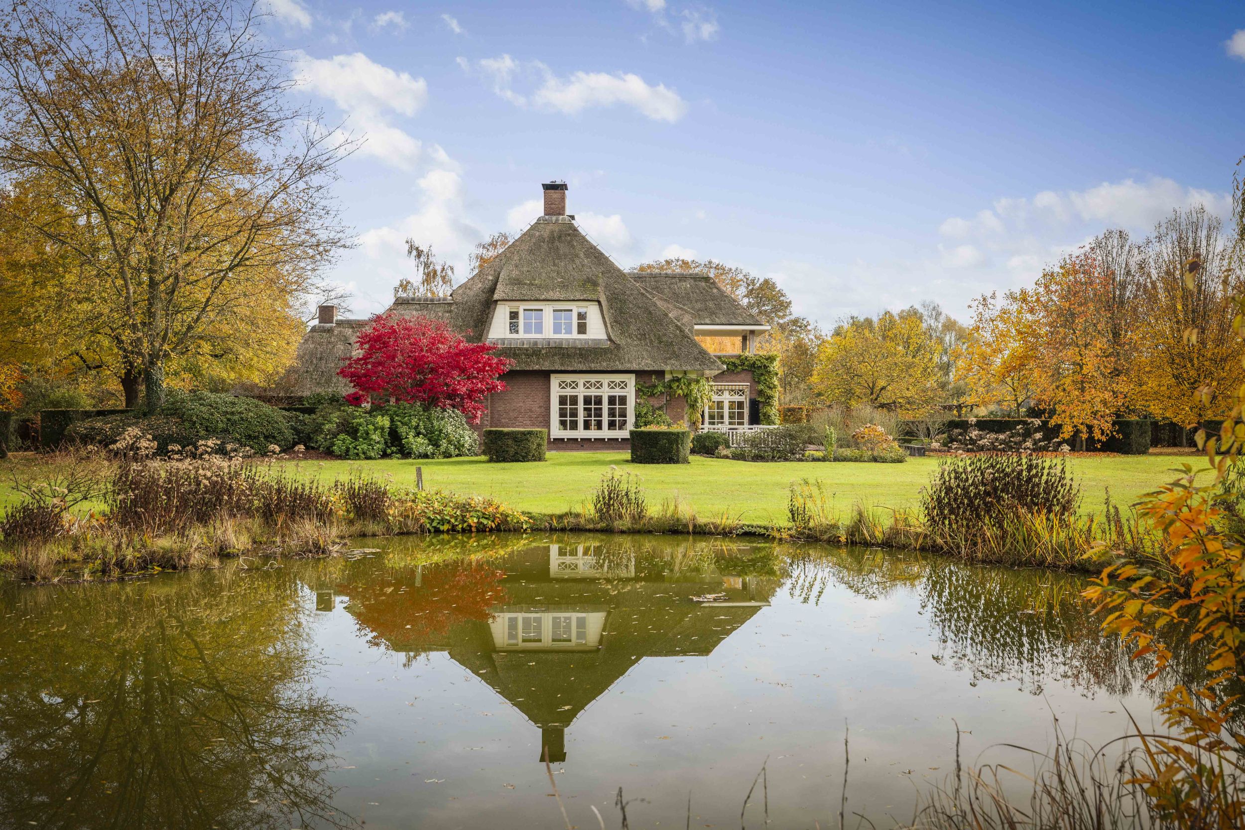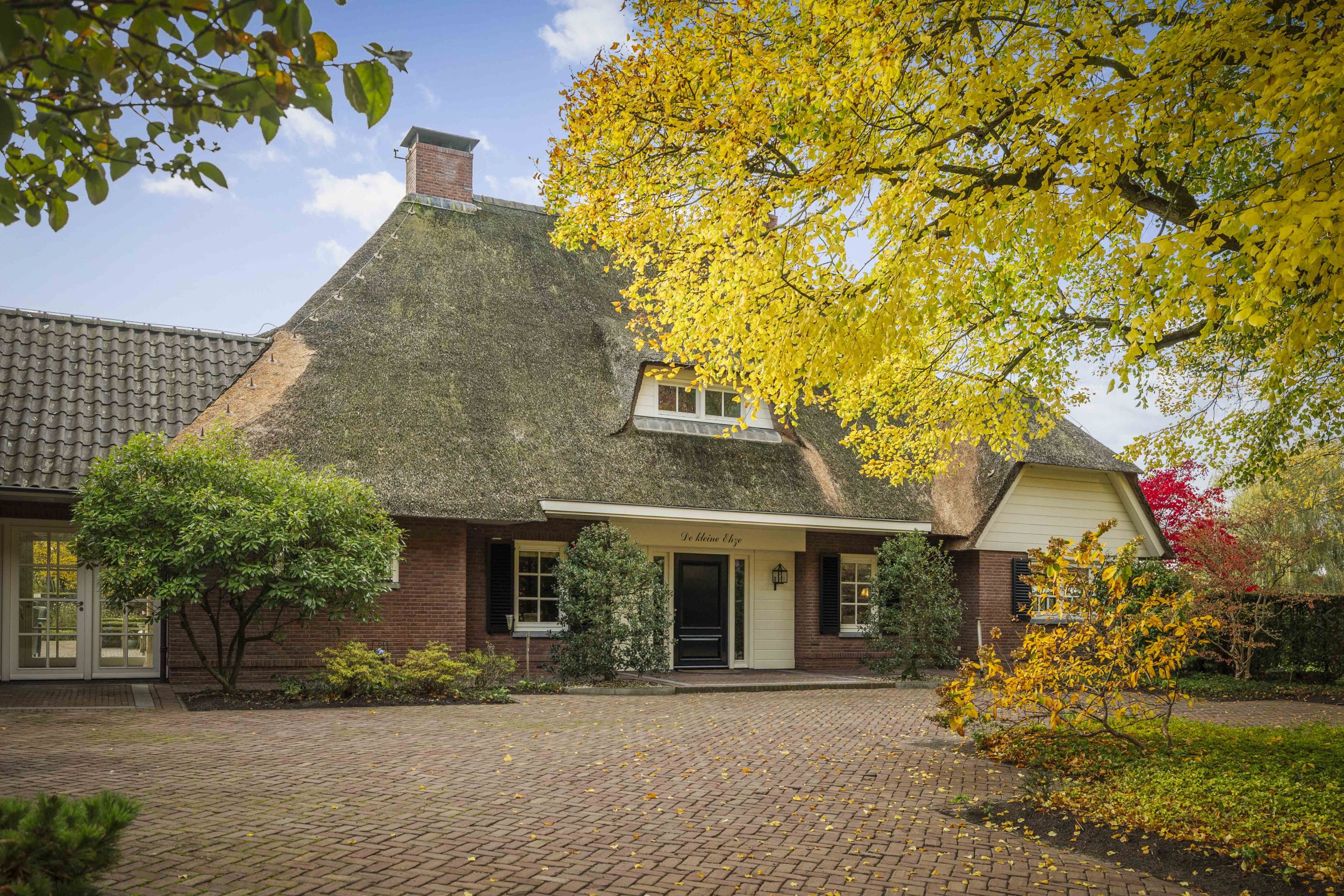 Even buiten de dorpskern van Almen, waar even verderop de Berkel voorbij stroomt, staat een sprookjesachtig landhuis. Een indrukwekkend mooie villa in de geliefde Engelse landhuisstijl. Met de rieten kap als een stola om haar schouders, de prachtige Engelse landschapstuin en de vergezichten op het coulisselandschap rondom, oogt dit elegante landhuis alsof het altijd al zo was. En, toch is ze nog piepjong in haar categorie, want ze werd in 2001 gebouwd. Alleen de schuur bij de oprit herinnert aan de voorganger van dit magnifieke huis. Villa De Kleine Ehze is een klassieke schoonheid, maar jong van lijf en leden.