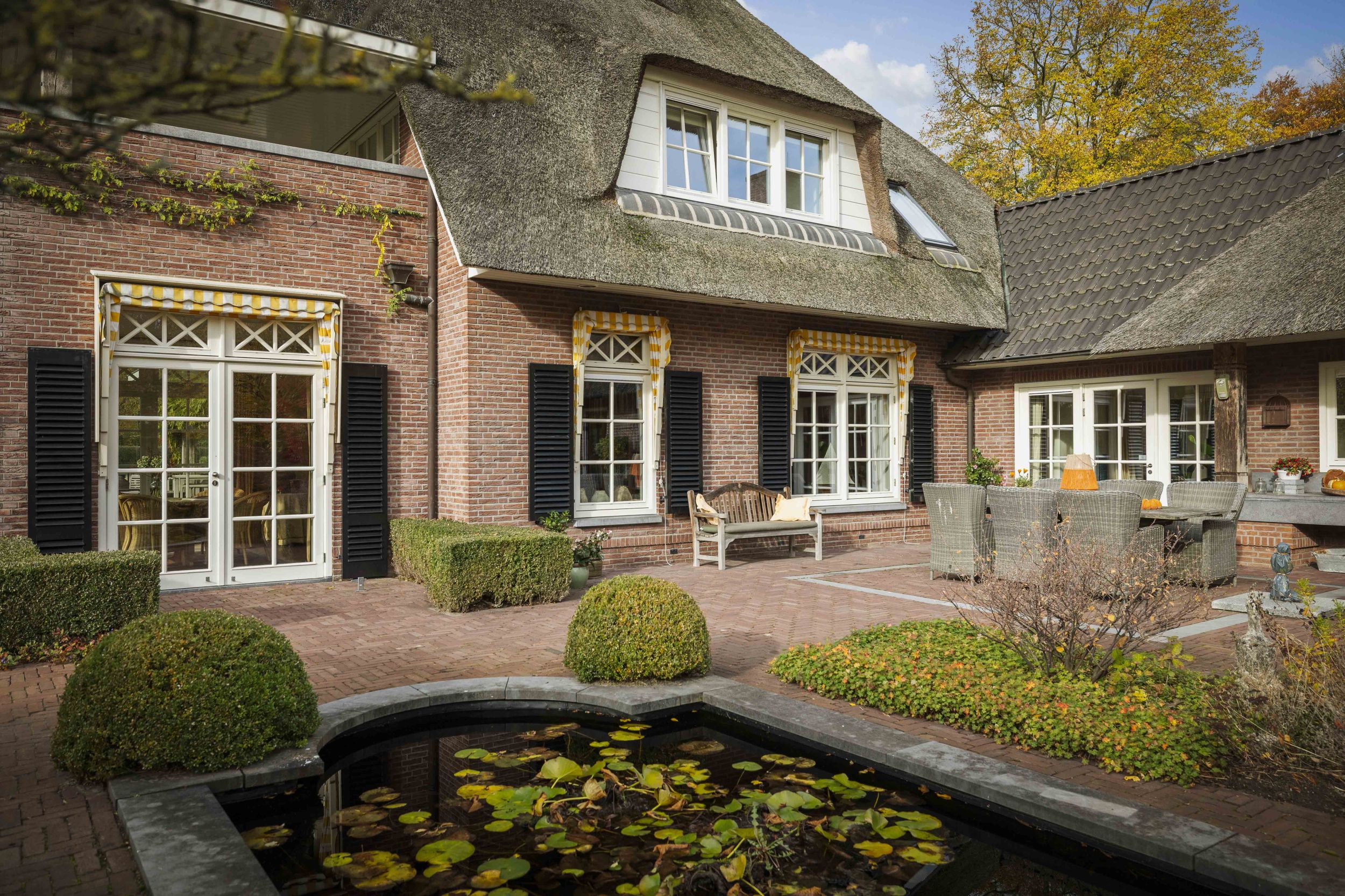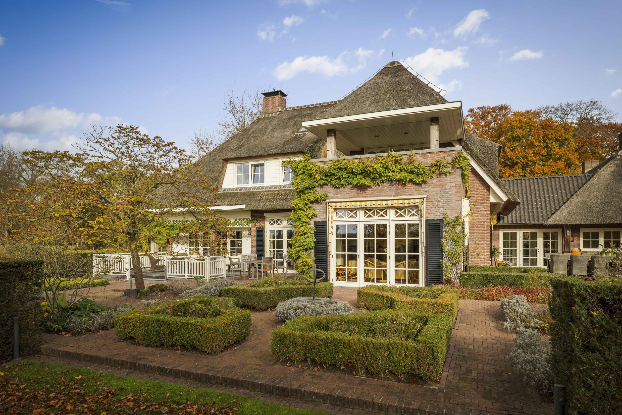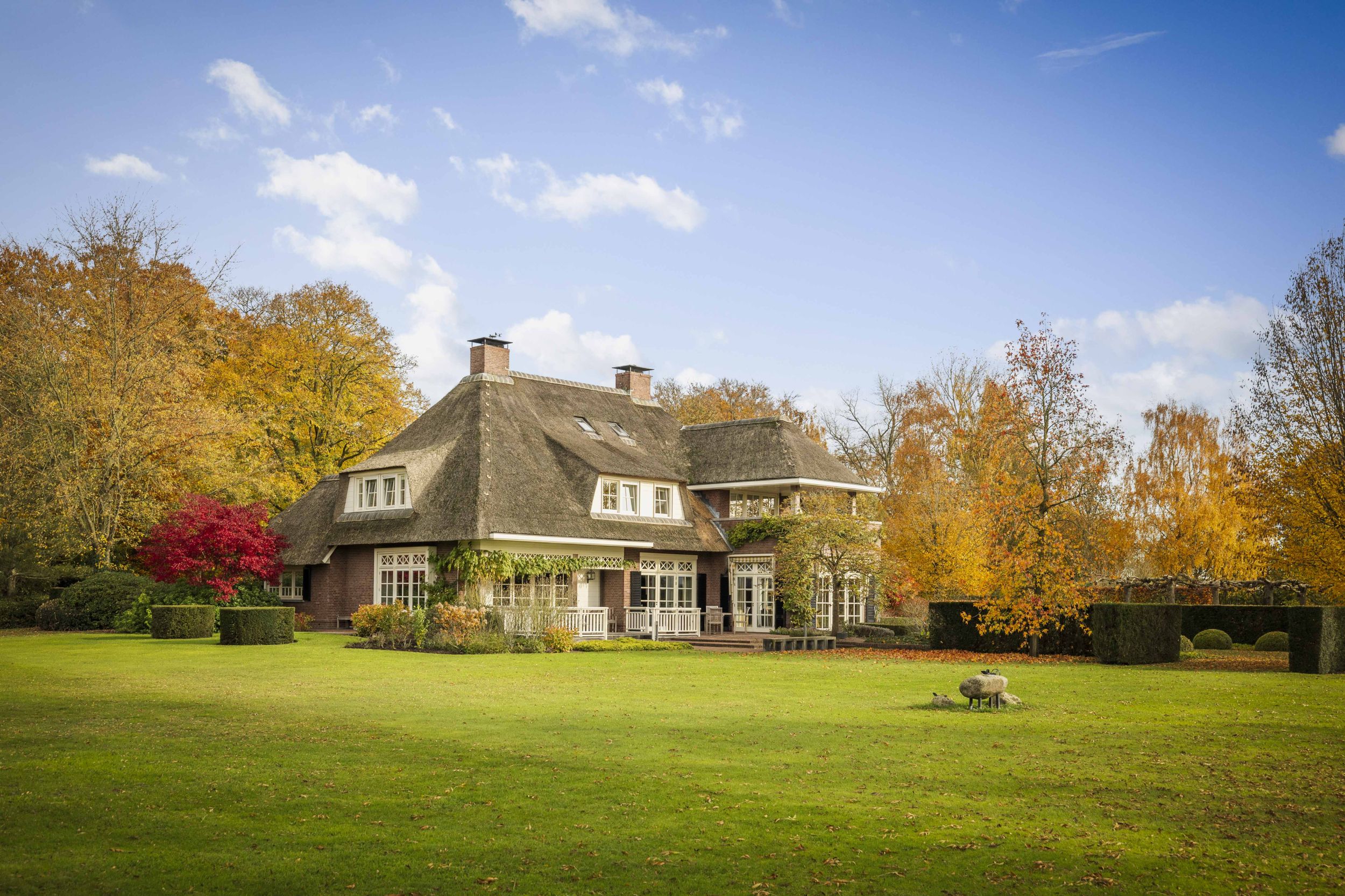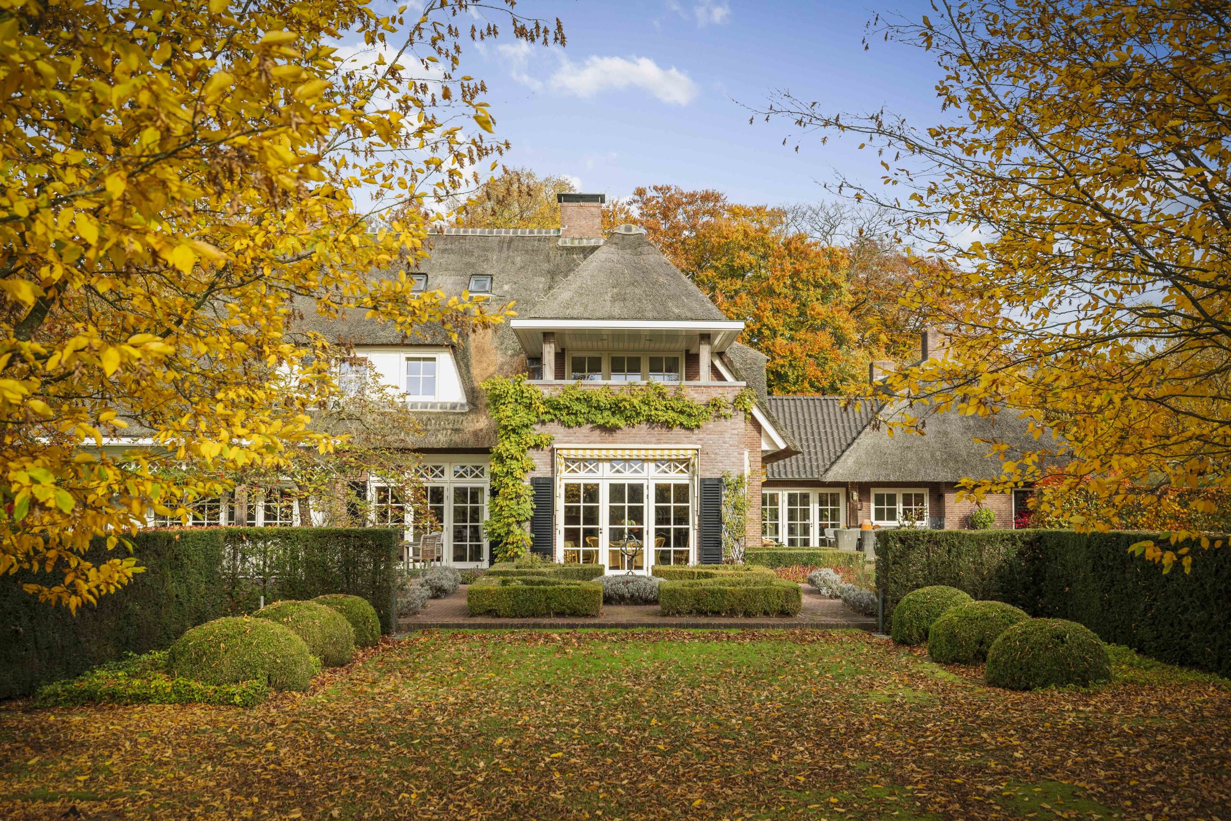 Even buiten de dorpskern van Almen, waar even verderop de Berkel voorbij stroomt, staat een sprookjesachtig landhuis. Een indrukwekkend mooie villa in de geliefde Engelse landhuisstijl. Met de rieten kap als een stola om haar schouders, de prachtige Engelse landschapstuin en de vergezichten op het coulisselandschap rondom, oogt dit elegante landhuis alsof het altijd al zo was. En, toch is ze nog piepjong in haar categorie, want ze werd in 2001 gebouwd. Alleen de schuur bij de oprit herinnert aan de voorganger van dit magnifieke huis. Villa De Kleine Ehze is een klassieke schoonheid, maar jong van lijf en leden.