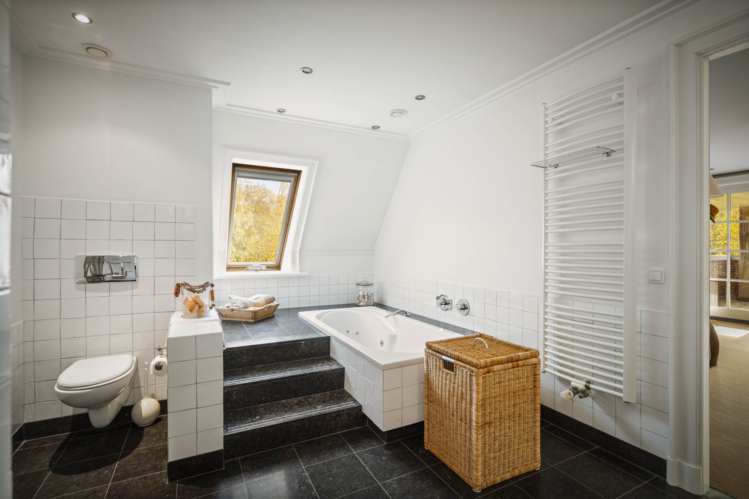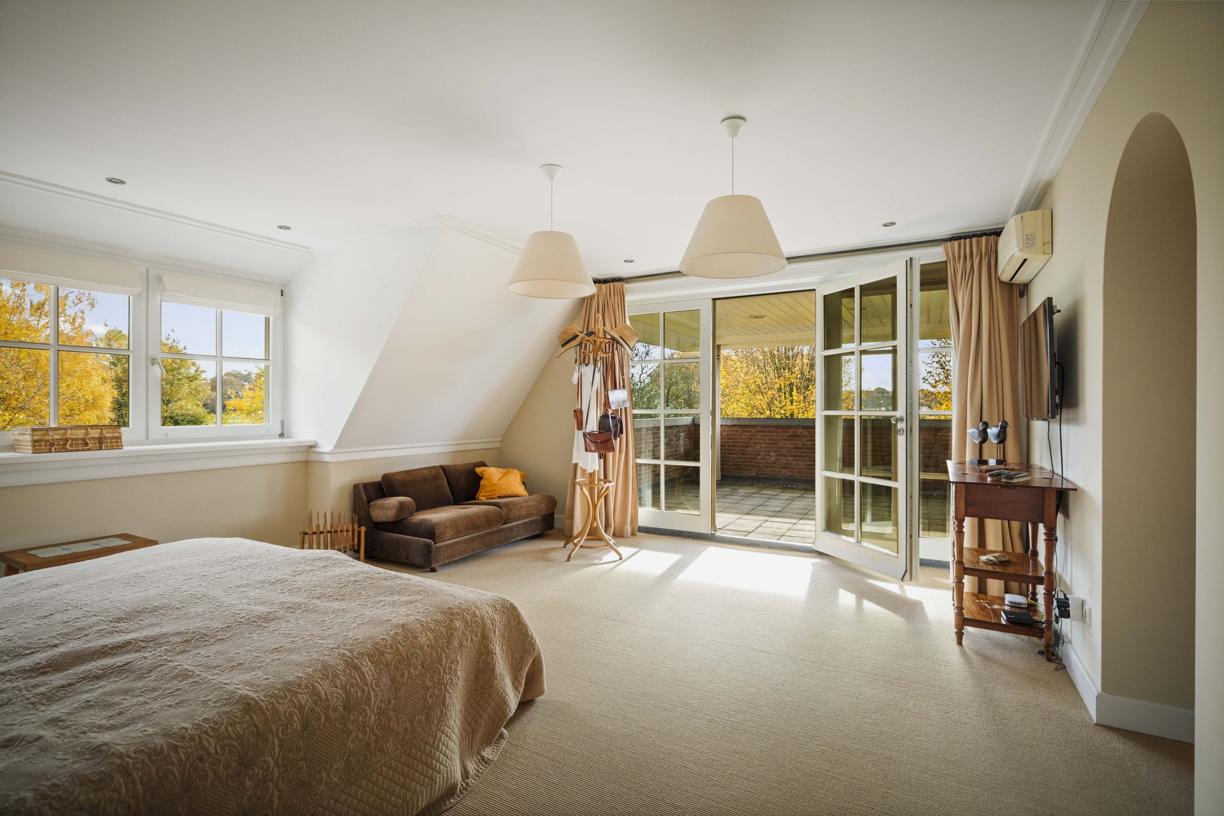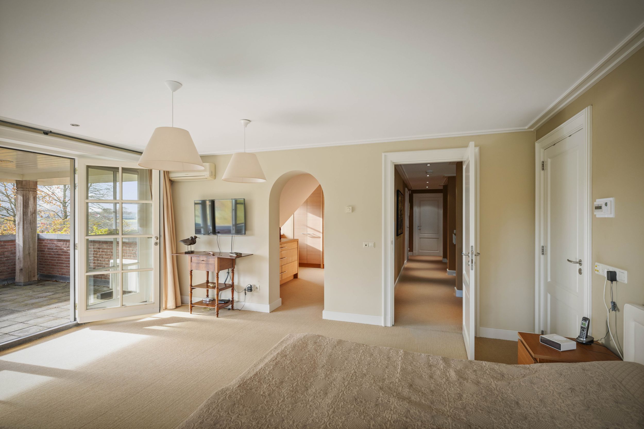 De ouderslaapsuite is voorzien van een fraaie inloopkast en een badkamer met inloopdouche, verzonken ligbad met bubbelfunctie, een wastafelmeubel met twee wasbakken en een WC. Vanuit de kamer heeft u toegang tot de spectaculaire loggia, van waaruit u een subliem uitzicht heeft over de tuinen en de omliggende landerijen.