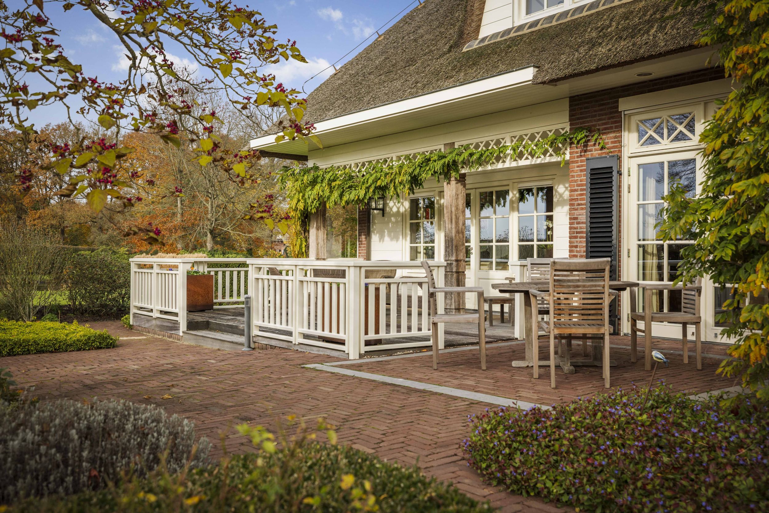 Het huis wordt omringd door een prachtig terras met diverse zitjes, een siervijver en rijkgevulde borders. Langs de gevels groeien wisteria’s in wit en paars. De siertuin, die volgens de beginselen van de Engelse landschappelijke stijl is ingericht, is een lust voor het oog en een walhalla voor groene vingers. Er is een grote waterpartij, er zijn uitgestrekte gazons en een keur aan bomen, heesters, borders en bloembedden.