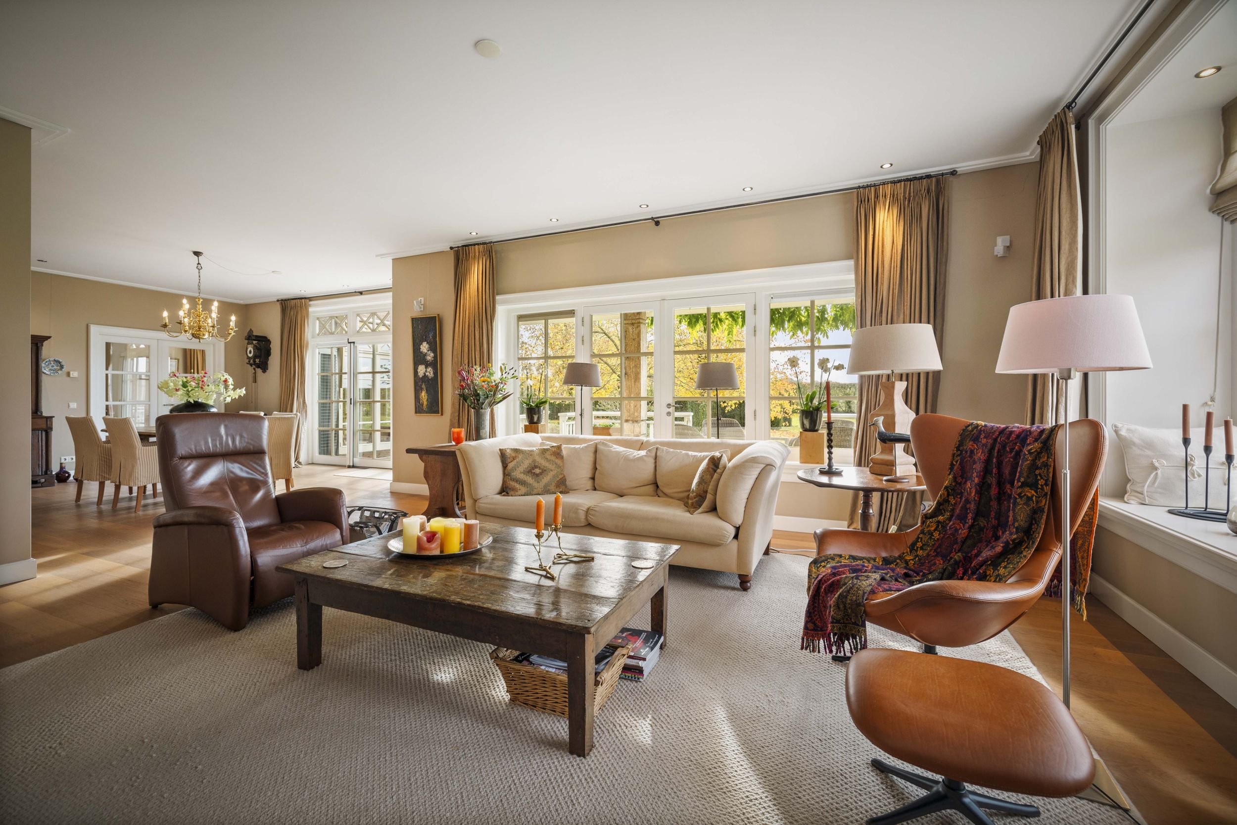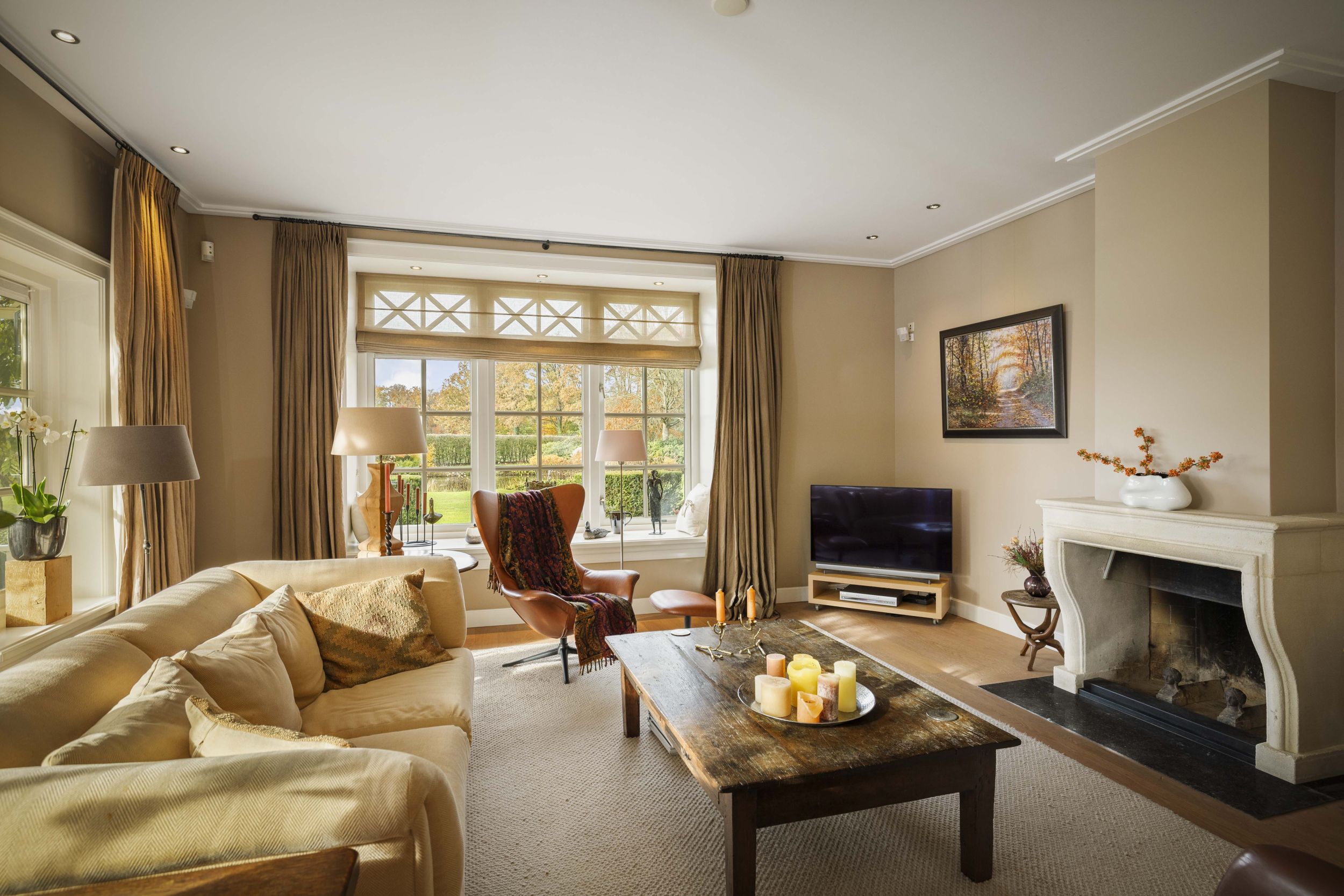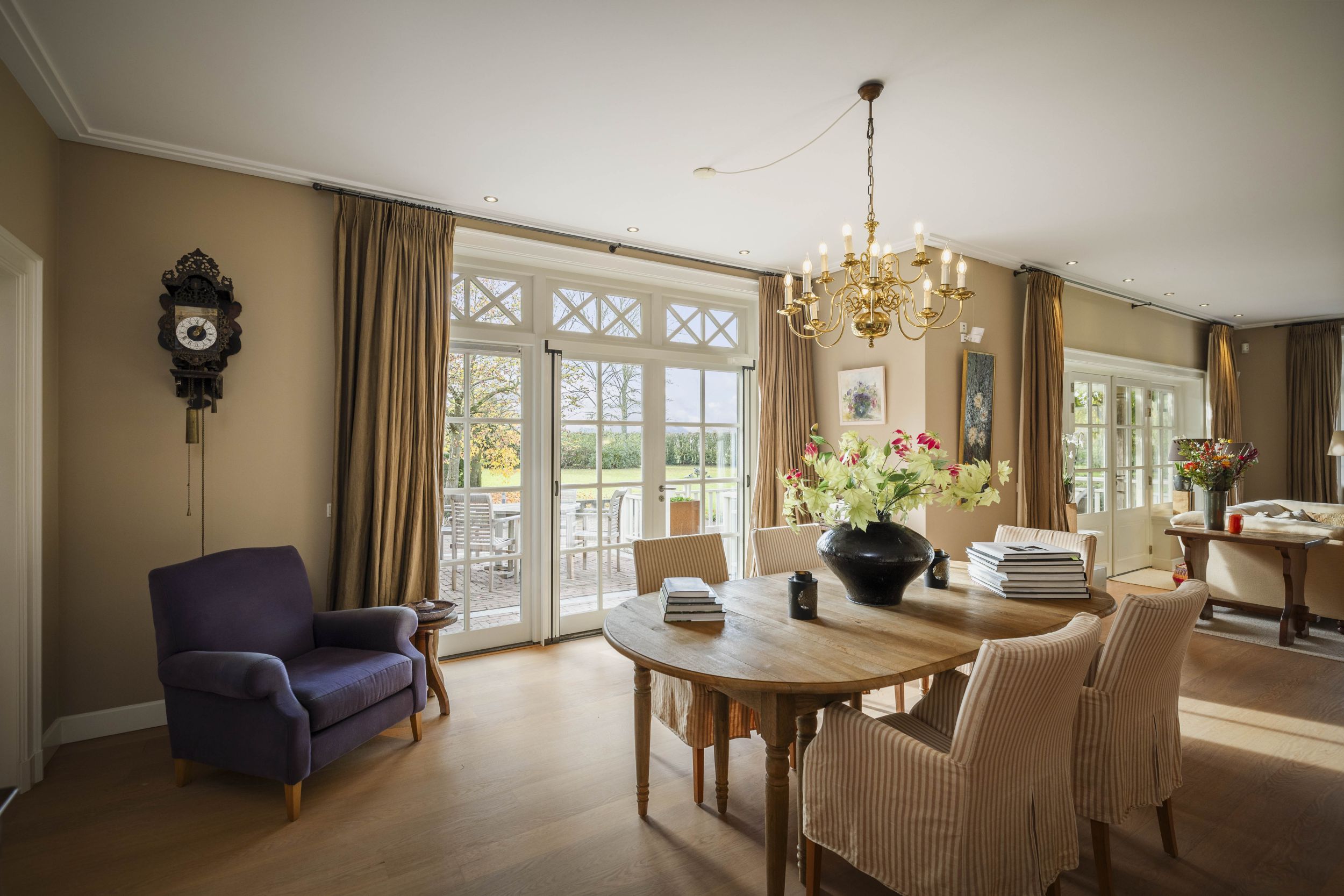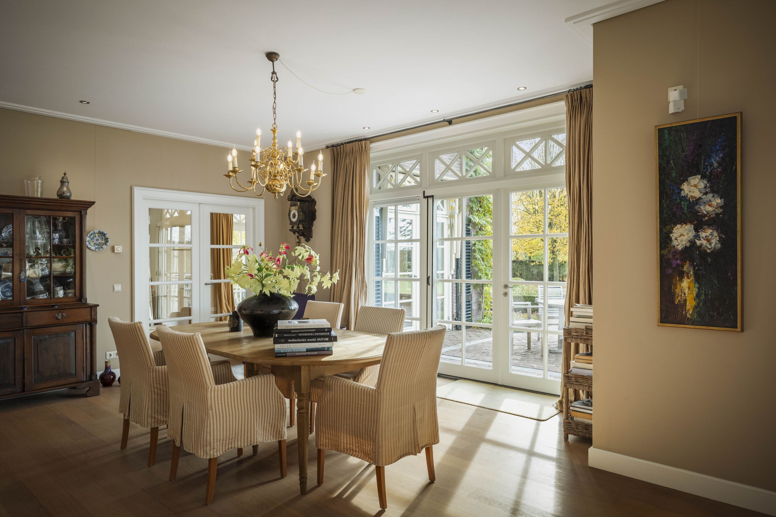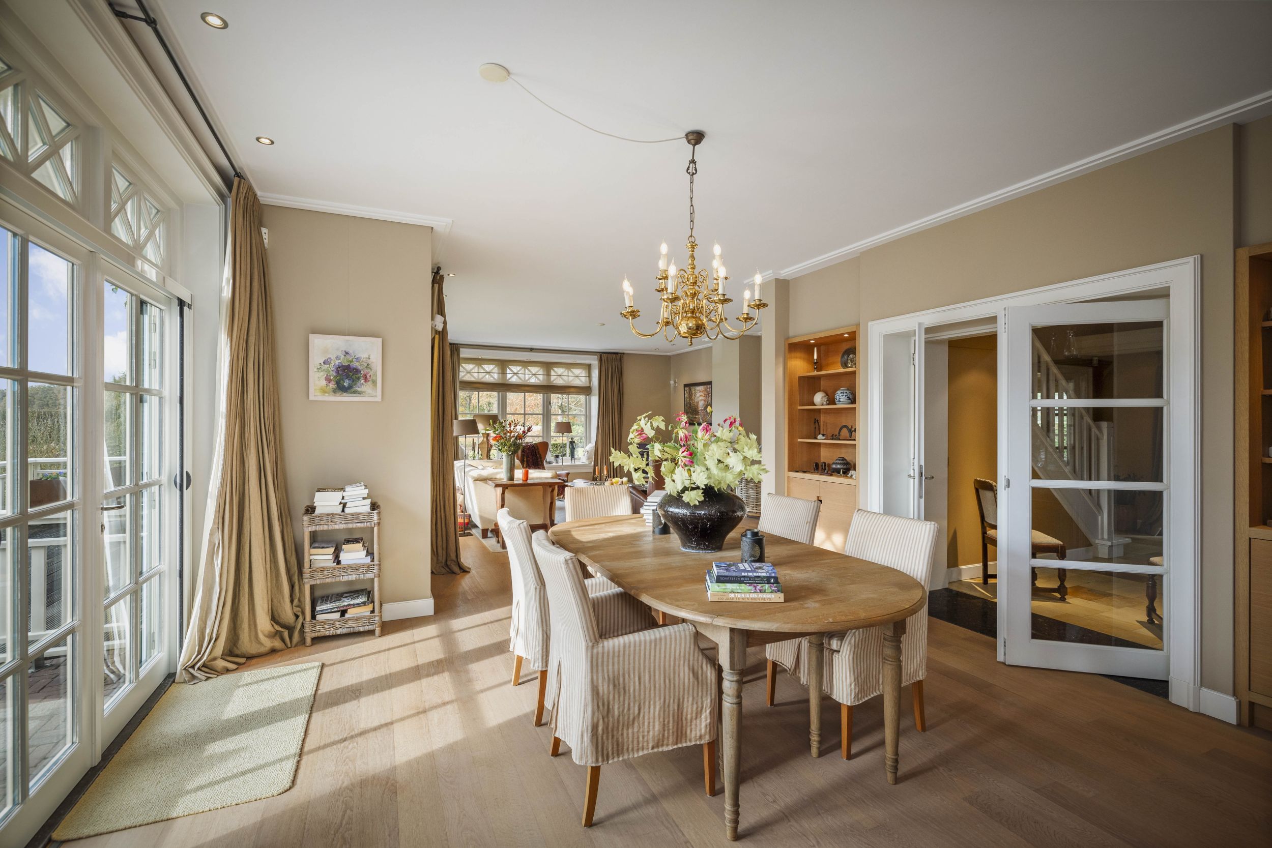 De riante woonkamer, die tevens vanuit de keuken toegankelijk is, is doordrenkt met zonlicht door de ideale noord-zuidoriëntatie van de villa. Op de vloer ligt een robuuste parketvloer in warm eiken, die prima samenwerkt met de vloerverwarming die door het huis is aangebracht. In het hart van de kamer een klassieke openhaard met een fraaie schouw van Franse zandsteen. De diepe bloemvensters bieden een lieflijk zitje met uitzicht op de tuin. Vanuit de living, bij de charmante eethoek, toegang tot het zonneterras middels de beglaasde openslaande deuren. Door het huis zijn diverse maatwerk eikenhouten boekenkasten aangebracht.