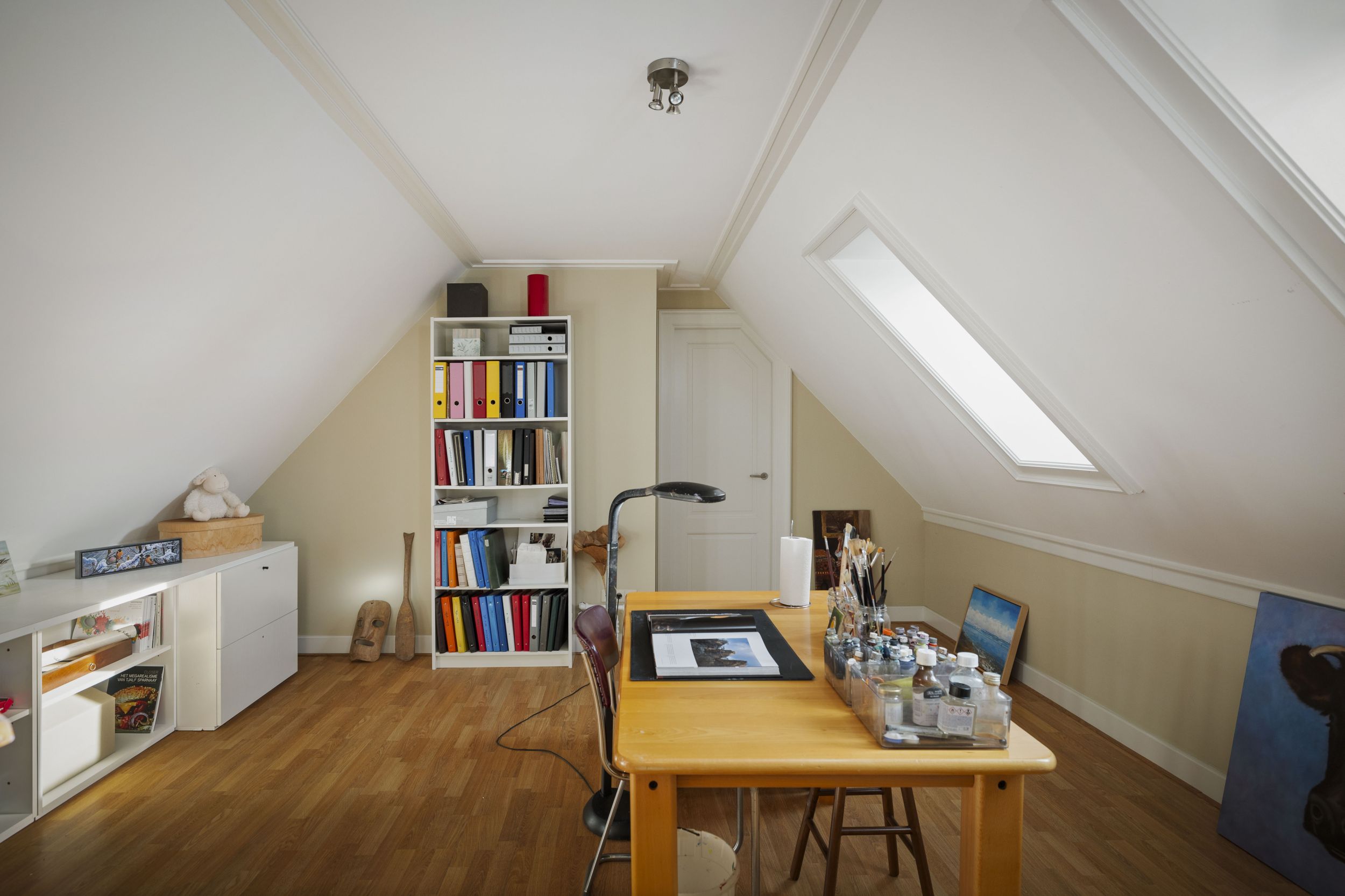 Op de tweede verdieping, te bereiken per vaste trap, nog eens drie grote ruimtes met het grote atelier c.q. gastenverblijf en de bergzolders.