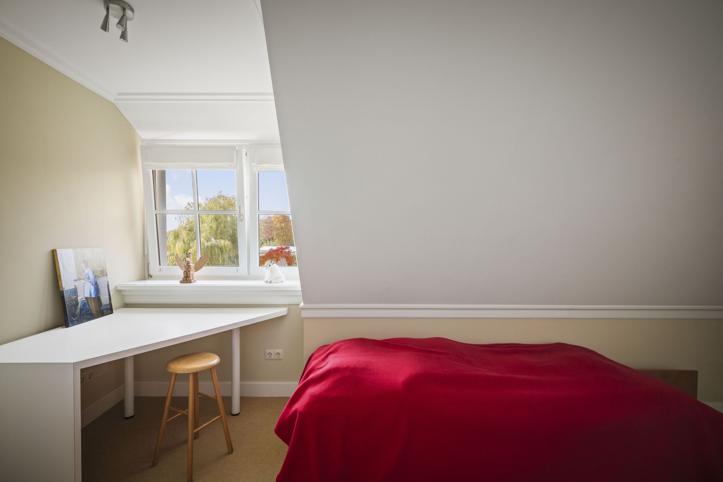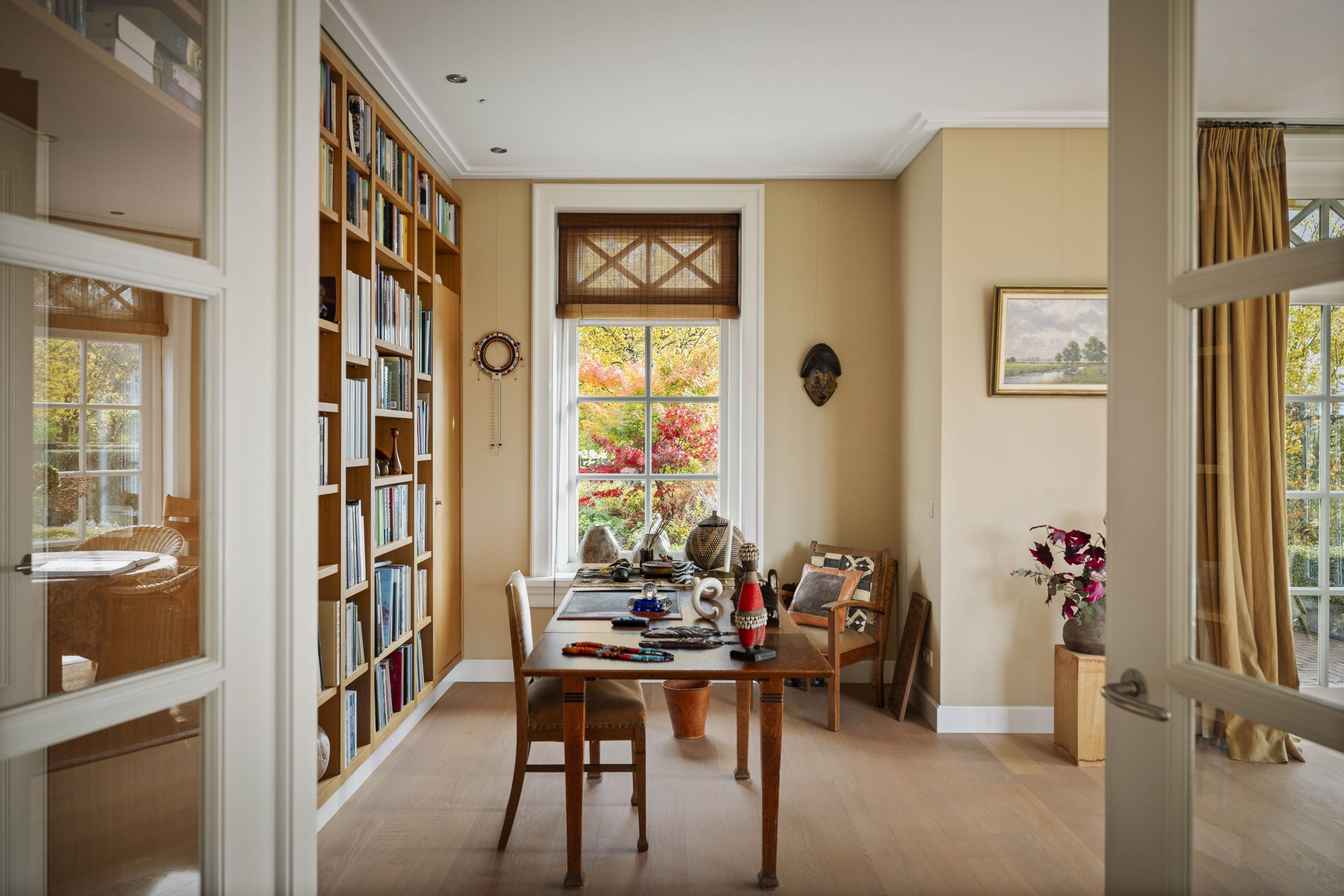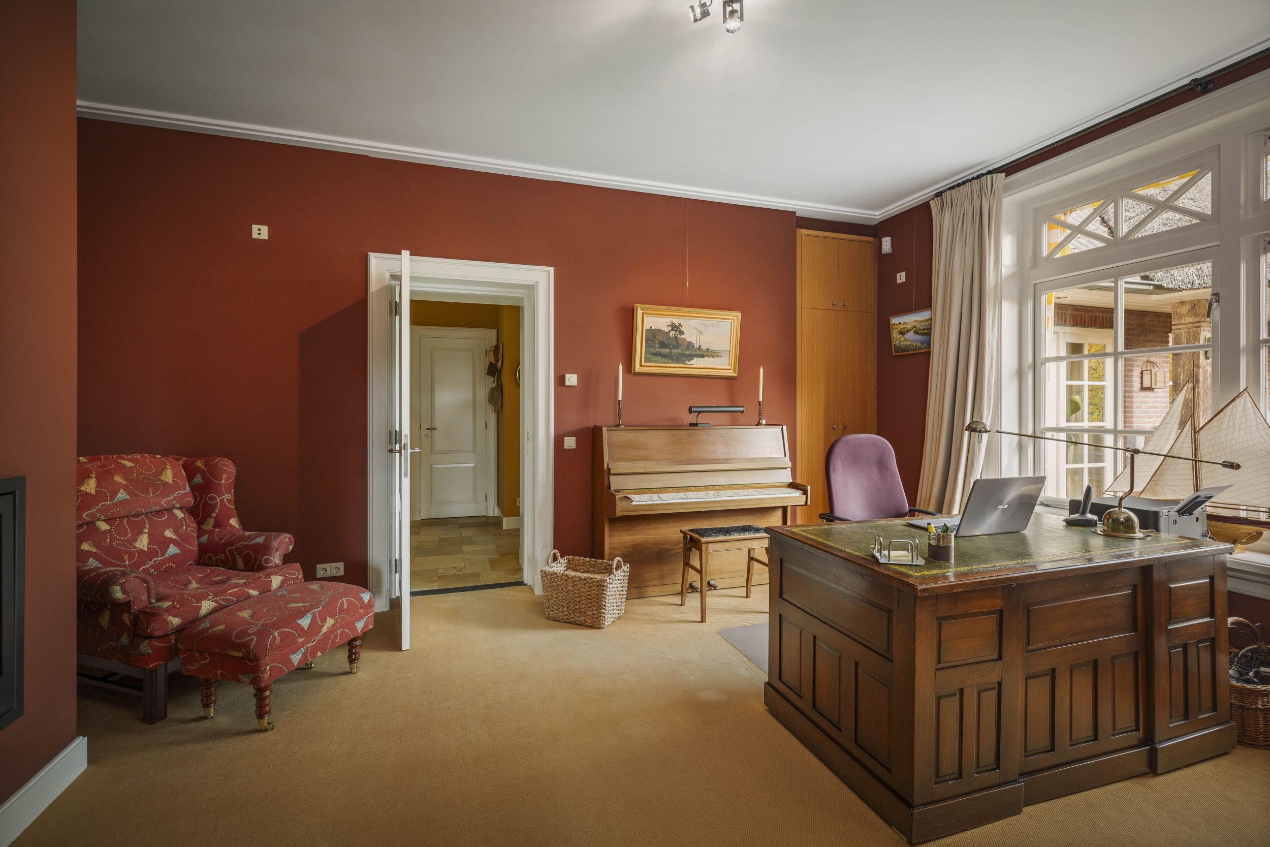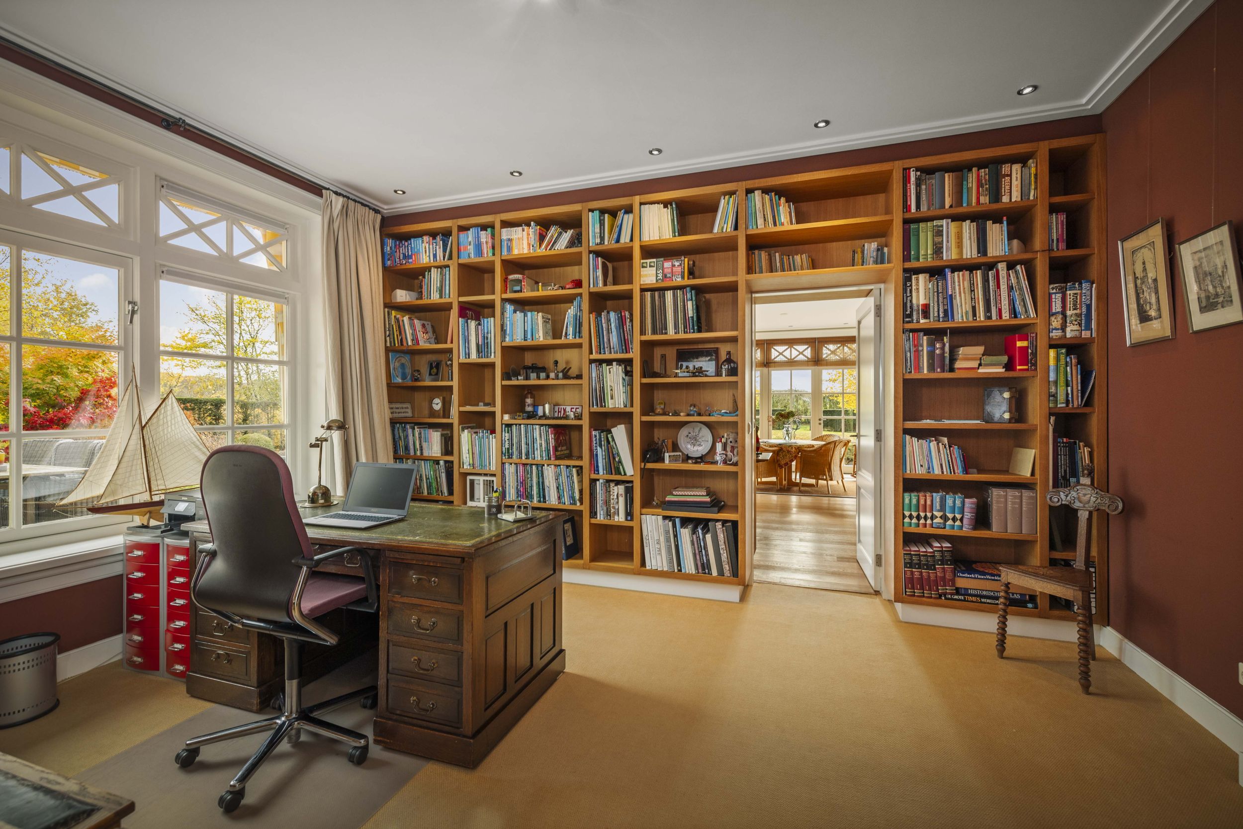 De study is een heerlijke ruimte waar u zich, omringd met boeken en een schitterend uitzicht op de tuinen, kunt richten op uw werkzaamheden, uw hobby’s of dat ene boek, dat nog gelezen of misschien zelfs geschreven moet worden.